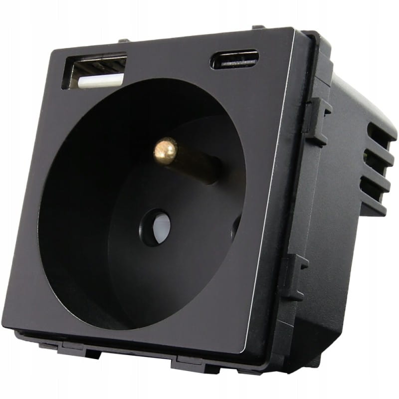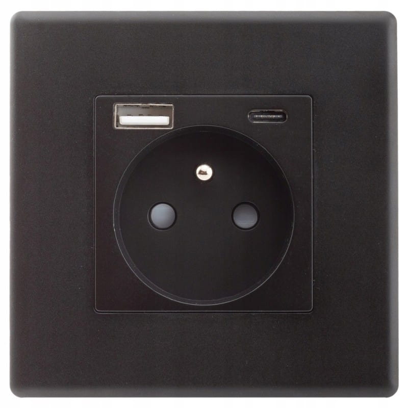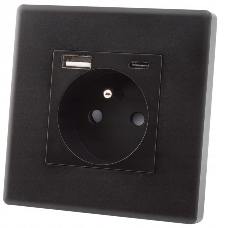 Gniazdo Czarne z Bolcem + Podwójna Ładowarka USB A+C 20W Zestaw z Ramką Plastikową