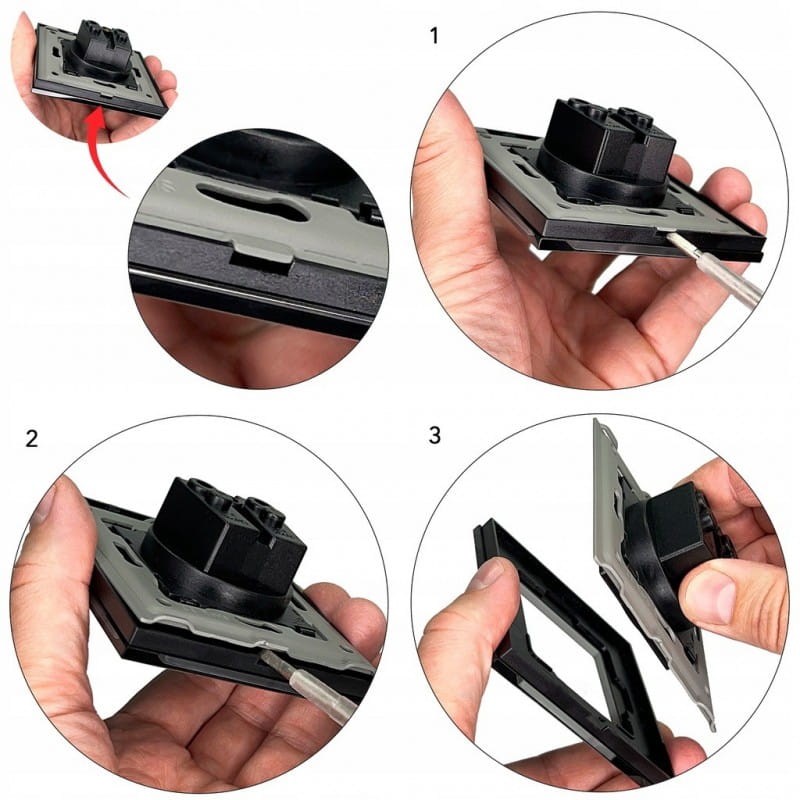 Przed zainstalowaniem w puszce moduł należy odłączyć od ramki przy użyciu śrubokręta: należy zlokalizować otwór u podstawy ramki, następnie delikatnie podważyć, aż oprawka odepnie się od modułu